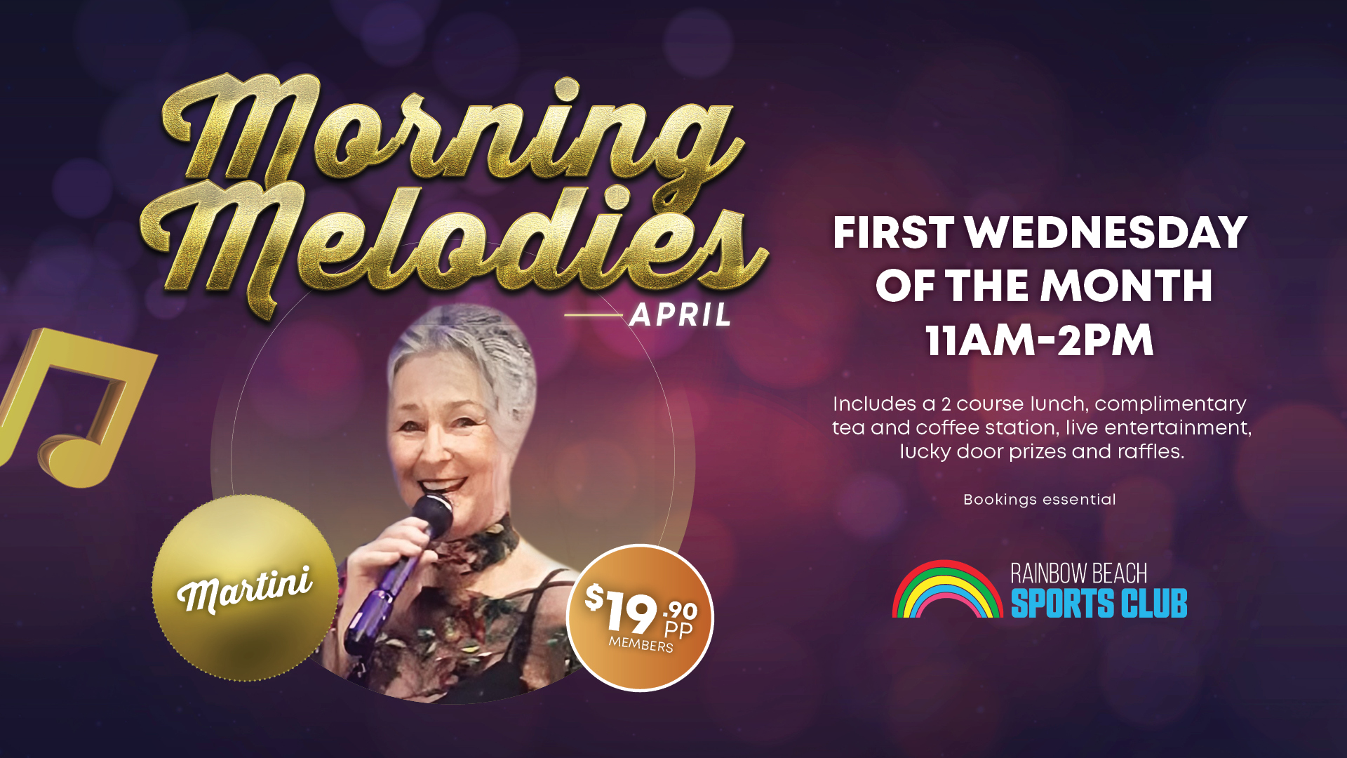 the first Wednesday of every month is our lively Morning Melodies activity, with a 2-course lunch included in your $19.90 ticket This month, the lovely Martini will be hosting the event, and she looks forward to seeing you there |