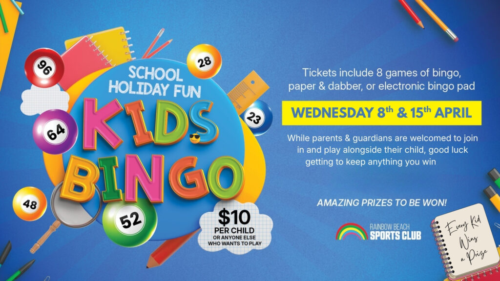KIDS BINGO has become a traditional school holiday activity here at Rainbow Beach, with dozens of great prizes on offer for winners of rounds to choose from and a genuinely…